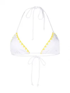 Leah faux-flower bikini-top from MC2 SAINT BARTH featuring multicolour, cotton blend, faux-flower detailing, triangle cup, contrasting trim, halterneck tie fastening and rear tie fastening. Be mindful to try on swimwear over your own garments..