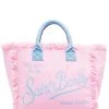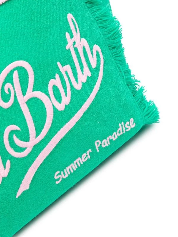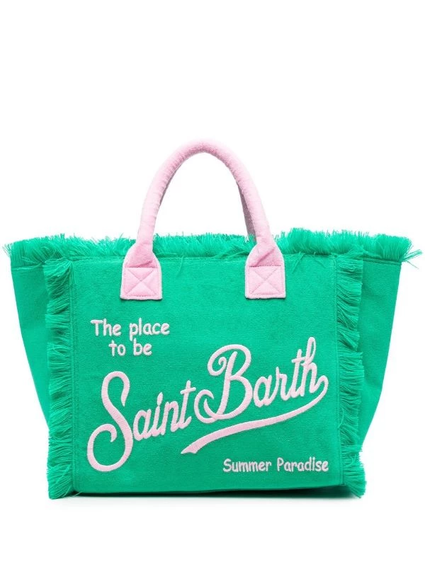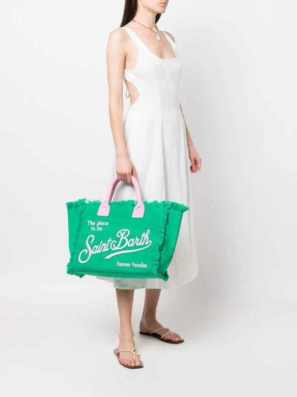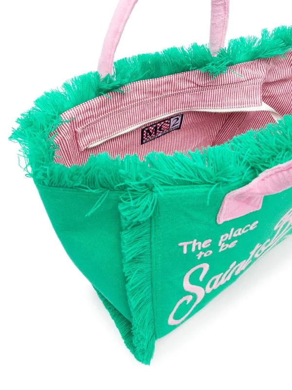 Hellgrün, Baumwolle, bestickt, ausgefranste Kanten, Reißverschluss oben, zwei runde Henkel, Hauptfach, Logo-Patch an der Innenseite, komplett gefüttert.