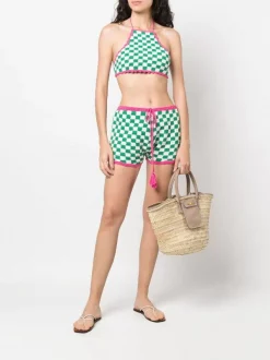 Gestricktes Design, Karomuster, Neckholder-Ausschnitt, Cropped-Design.