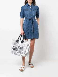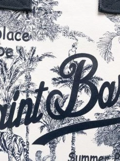 Wollweiß, Marineblau, Baumwolle, grafischer Print, Logo-Print vorne, Reißverschluss oben, zwei Henkel, Hauptfach.
