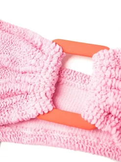Kaugummirosa, Rot, Stretch-Design, Seersucker-Muster, Bandeau-Style, trägerlos. Swimwear kann nur über Ihrer eigenen Unterwäsche anprobiert werden. Taucherbrille und Schnorchel sind optional….